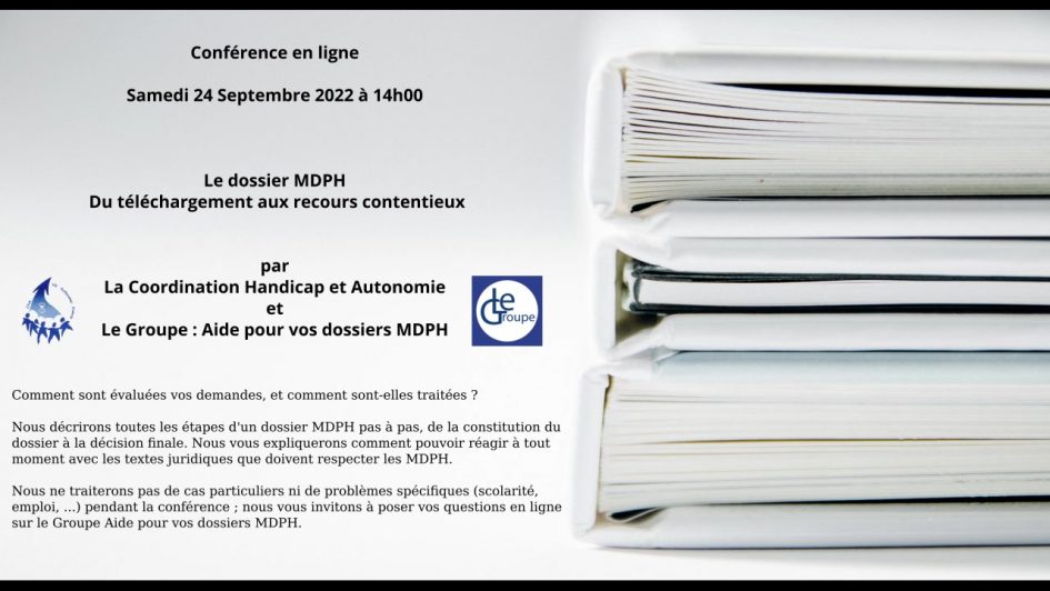 La Coordination Handicap et Autonomie et le Groupe Aide pour vos dossiers MDPH ont organisé le samedi 24 septembre 2022 à 14h00 une conférence en ligne sur le parcours des dossiers MDPH.